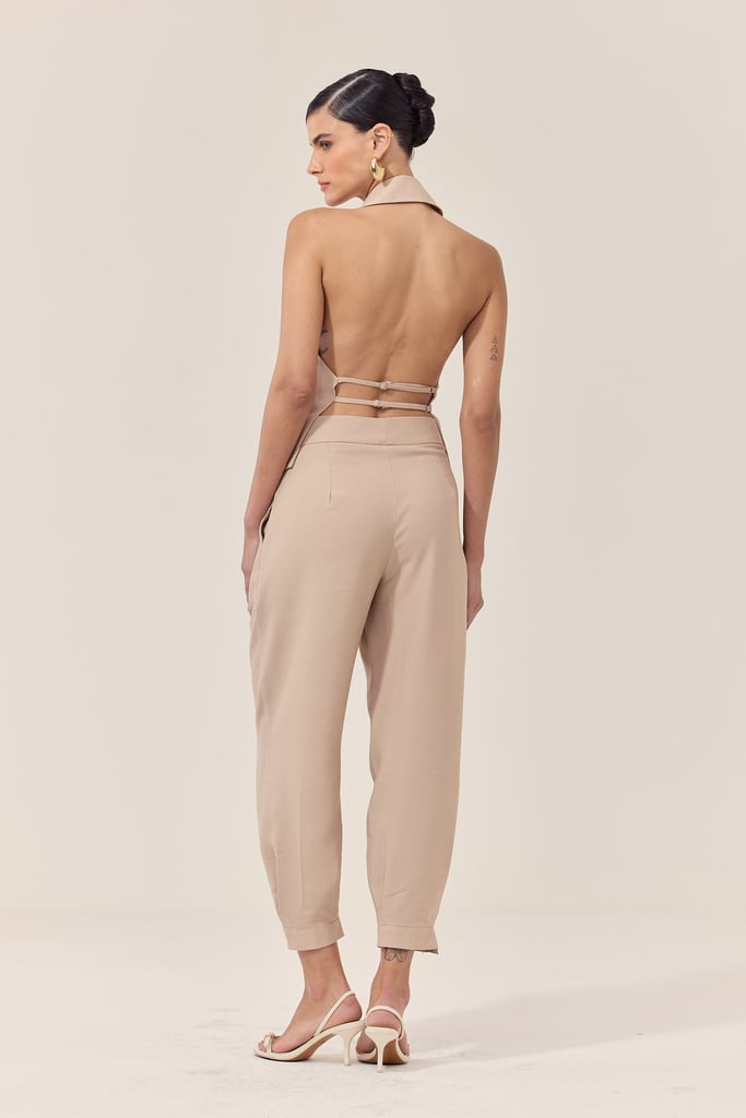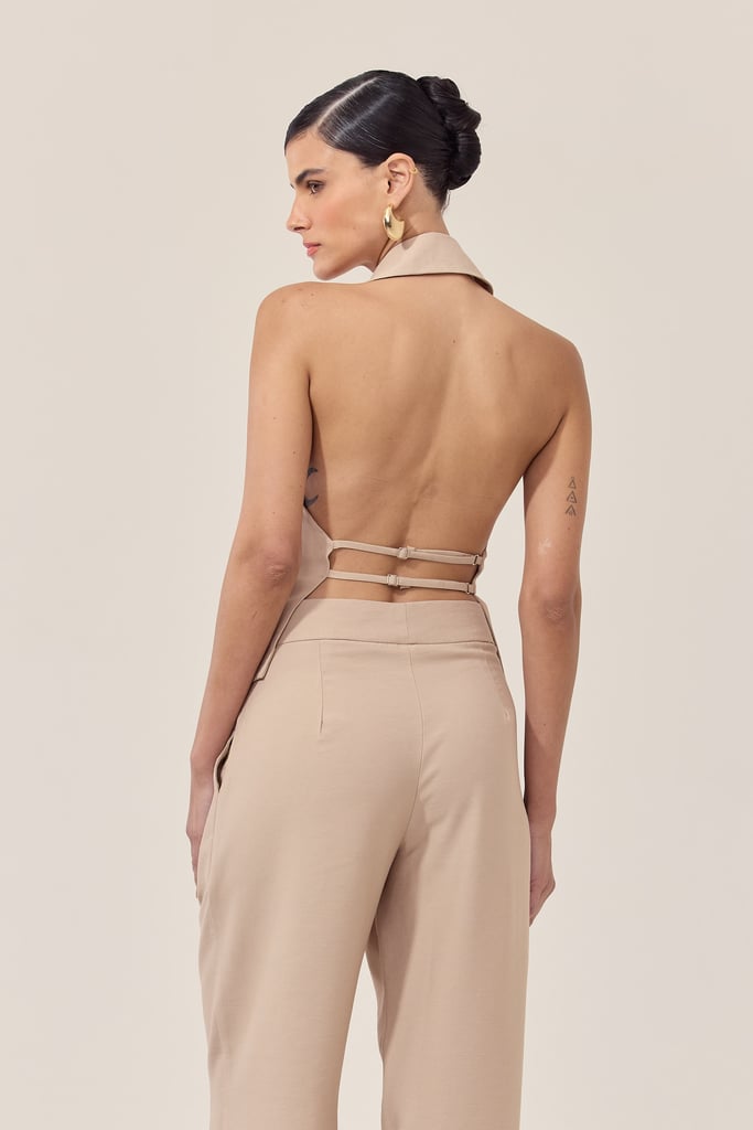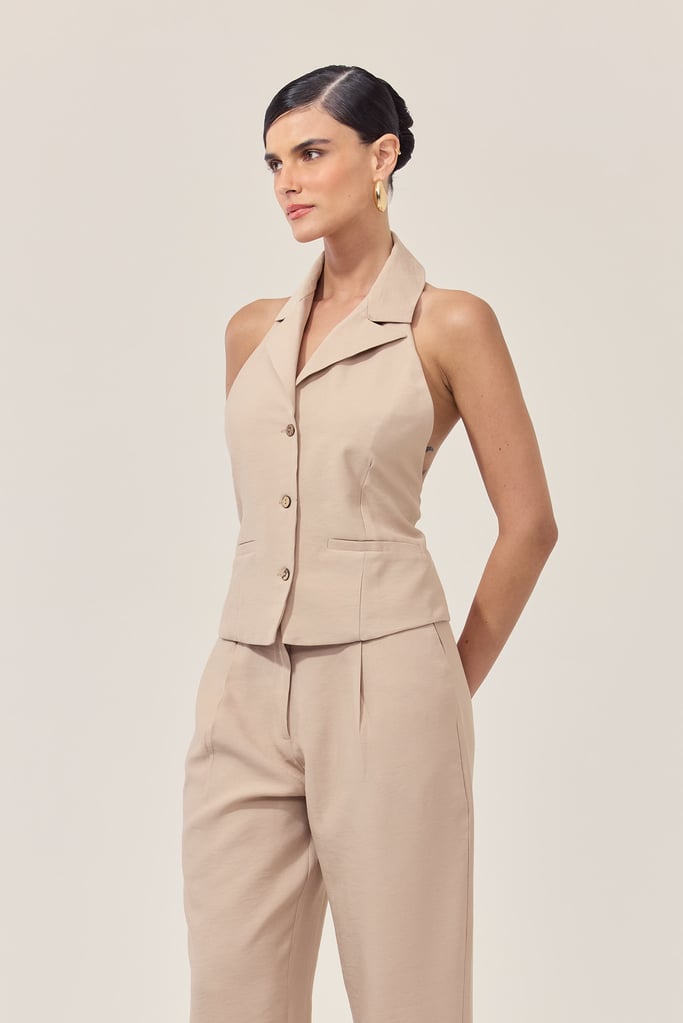 O Colete de Gola Halter Gabriela possui um decote em V e costas super despojadas, trazendo um toque de ousadia e elegância. As tiras ajustáveis com fivela metálica garantem um caimento perfeito, enquanto o fecho frontal com botões e a alça de cintura adicionam praticidade ao look. O detalhe das pinças dá aquele charme extra. É leve e confortável, ideal para qualquer ocasião. Aposte nessa peça versátil e arrase!