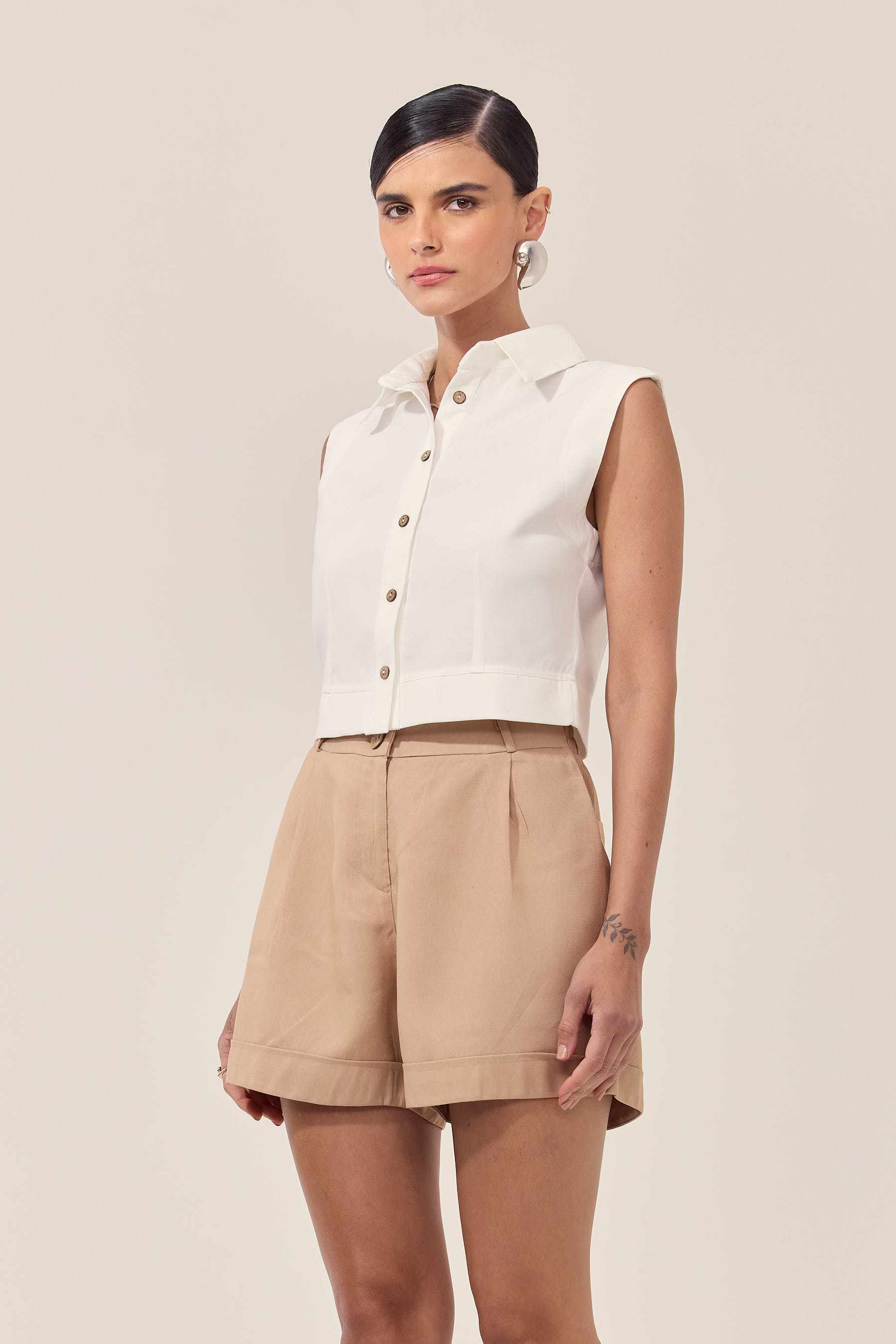 Essa regata apresenta uma gola que oferece um toque elegante e sofisticado. O fechamento em botões na parte frontal permite um ajuste personalizado, além de criar um visual único e arrojado. Ideal para os dias mais quentes, essa peça é perfeita para compor looks casuais e estilosos, seja para o dia a dia ou para momentos descontraídos. Combine com shorts, saias ou calças para um visual moderno e confortável. Pode ser usada sozinha ou combinada com casacos leves para dias mais frescos.