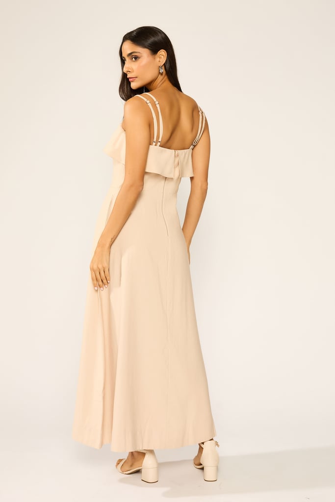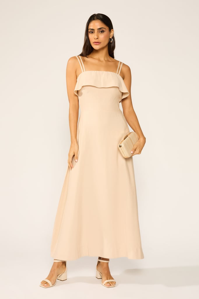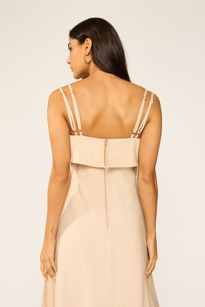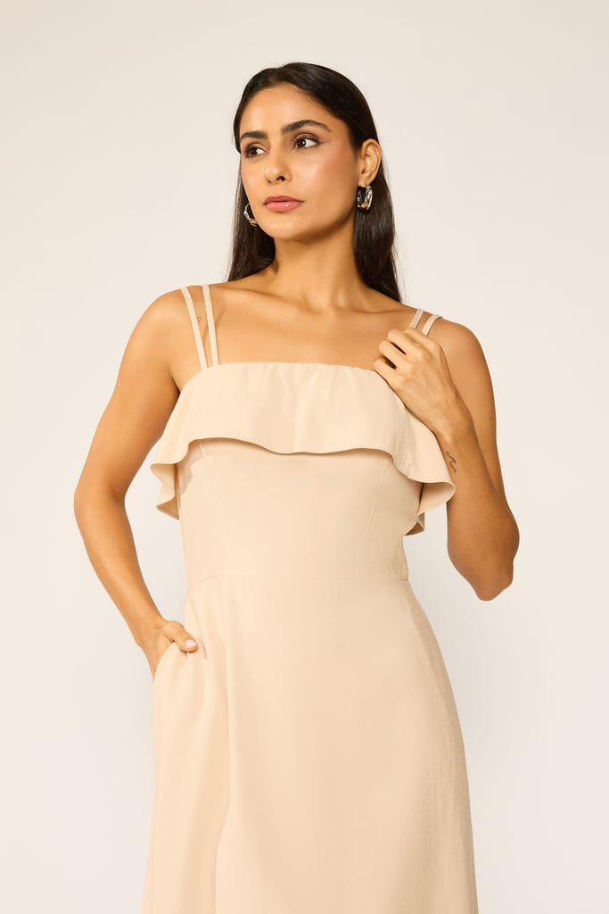 Esse vestido destaque-se com alças duplas ajustáveis e lapela no decote frente e costas. O recorte frontal e os práticos bolsos laterais oferecem estilo e funcionalidade. O fechamento de zíper nas costas e o forro garantem conforto e confiança. Versátil e elegante, é a escolha perfeita para diversas ocasiões.