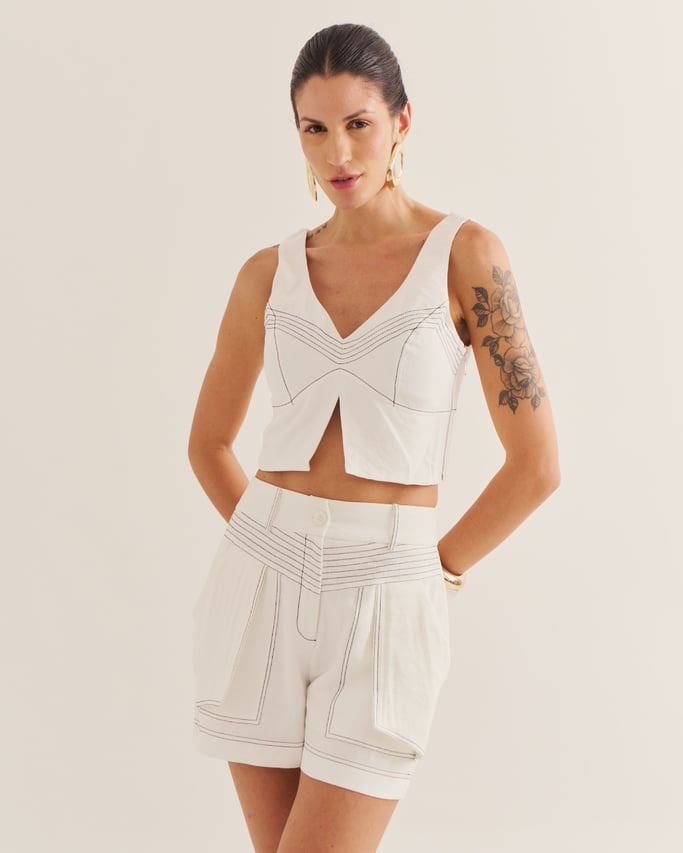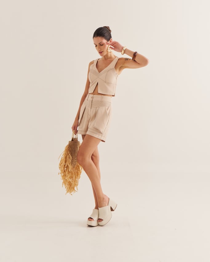 Confortável e estiloso, o shorts é confeccionado com costuras destacadas que adicionam charme ao design. Conta com bolso funcional, fechamento por zÃper e botão, unindo praticidade e modernidade em uma peça versátil para diversas produções.