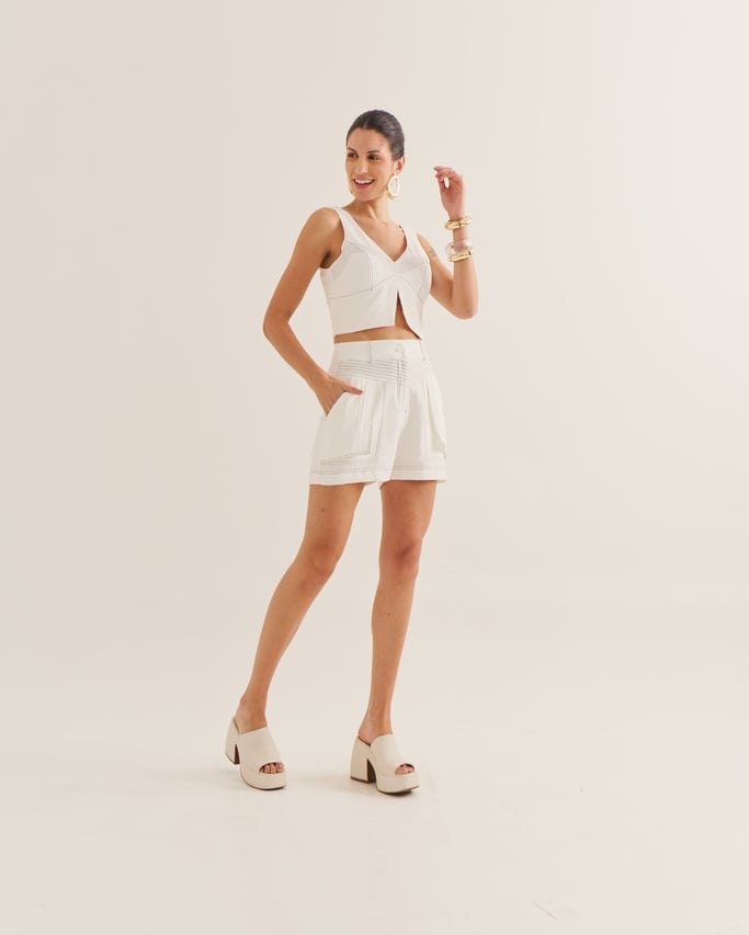 Confortável e estiloso, o shorts é confeccionado com costuras destacadas que adicionam charme ao design. Conta com bolso funcional, fechamento por zÃper e botão, unindo praticidade e modernidade em uma peça versátil para diversas produções.