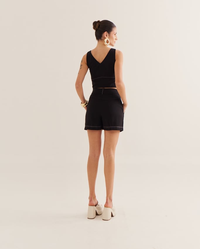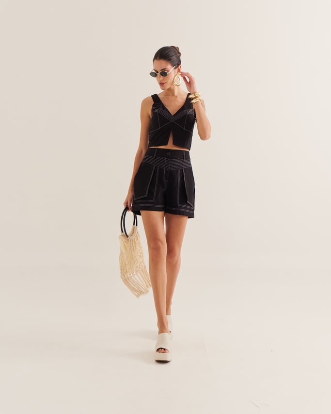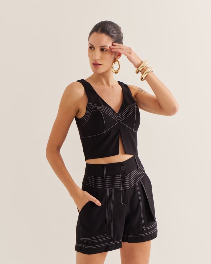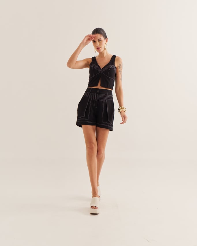 Confortável e estiloso, o shorts é confeccionado com costuras destacadas que adicionam charme ao design. Conta com bolso funcional, fechamento por zÃper e botão, unindo praticidade e modernidade em uma peça versátil para diversas produções.