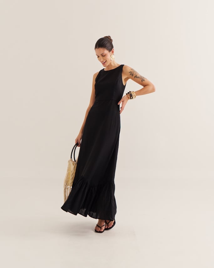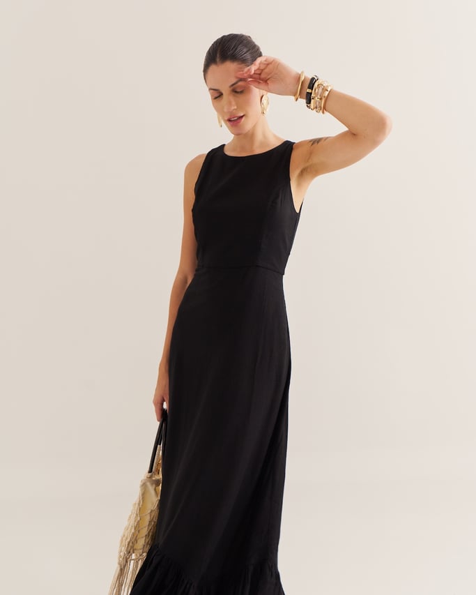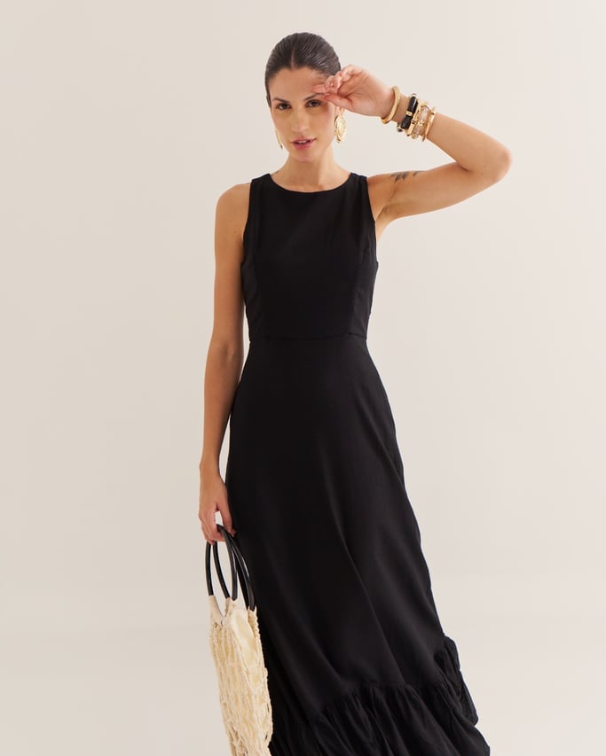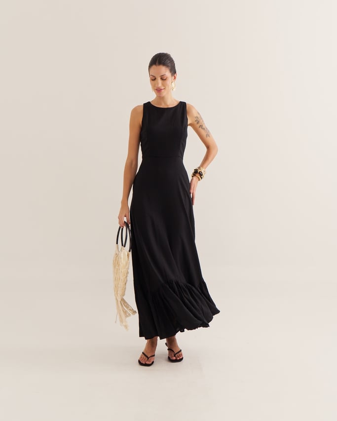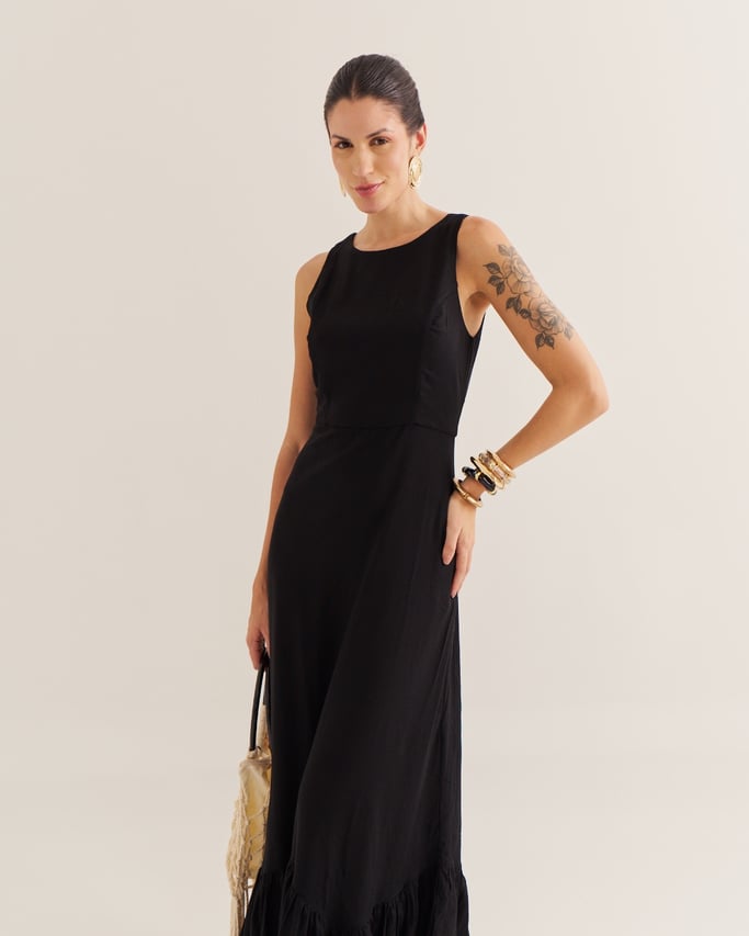 Confeccionado em tecido leve, este vestido longo traz barra com babados volumosos, garantindo charme e fluidez a cada passo. Possui fechamento por zíper na parte traseira, que proporciona praticidade e ótimo caimento. Perfeito para ocasiões especiais, jantares ou eventos ao ar livre, é aquela peça que une sofisticação e feminilidade em um só look.