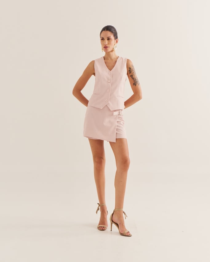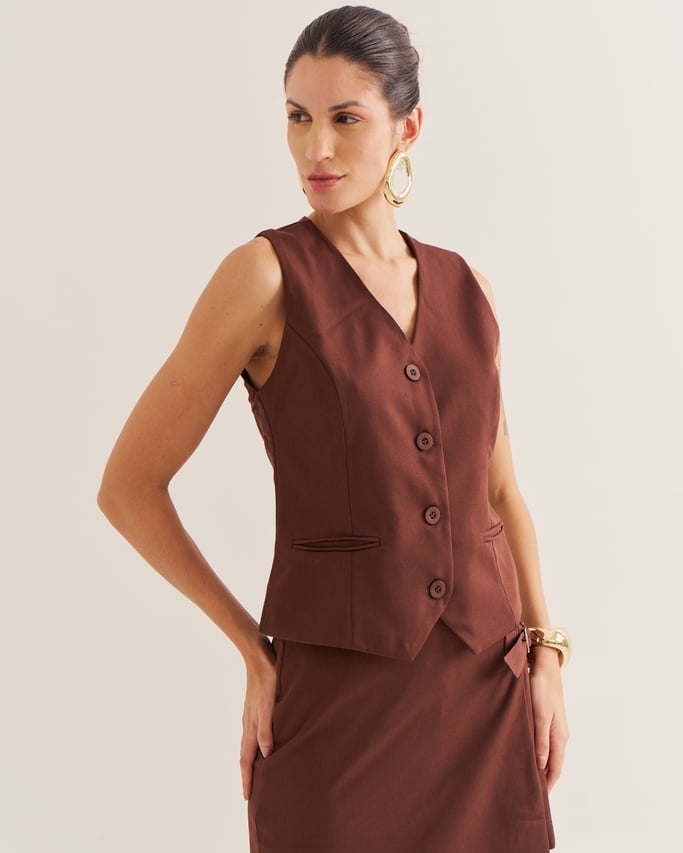 Elegante e atemporal, o Colete Sofia é confeccionado em alfaiataria garante caimento leve e sofisticado. Possui dupla camada de tecido que valoriza a estrutura da peça, bolso frontal fake e fechamento por quatro botões no mesmo tom. O decote em V adiciona modernidade e versatilidade, tornando-o perfeito para compor produções tanto casuais quanto formais.